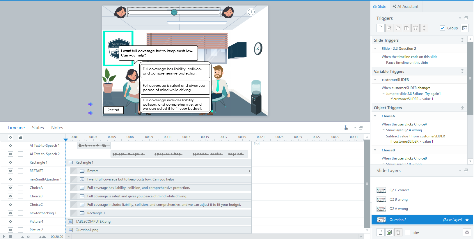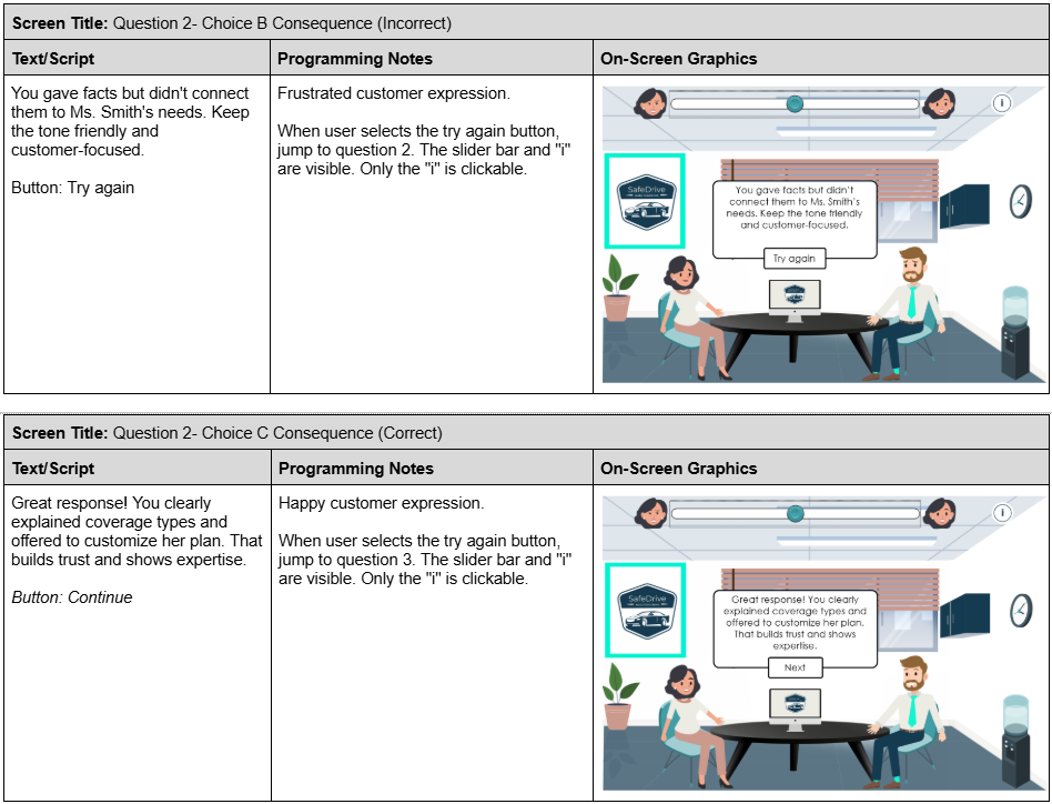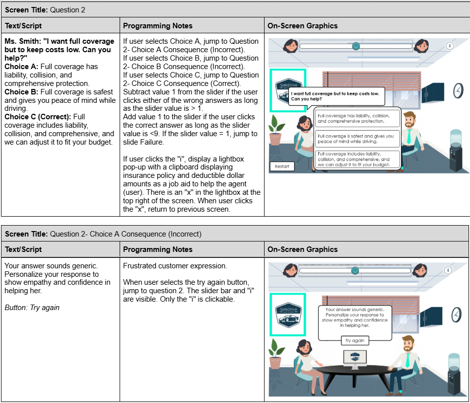 From there, I created a text-based storyboard for a fictional customer service scenario. The learner steps into the shoes of an insurance agent and navigates customer needs through a branching dialogue. Each choice impacts the customer satisfaction slider, simulating emotional responses and modeling consequences in real time.