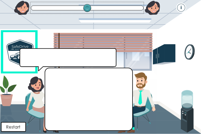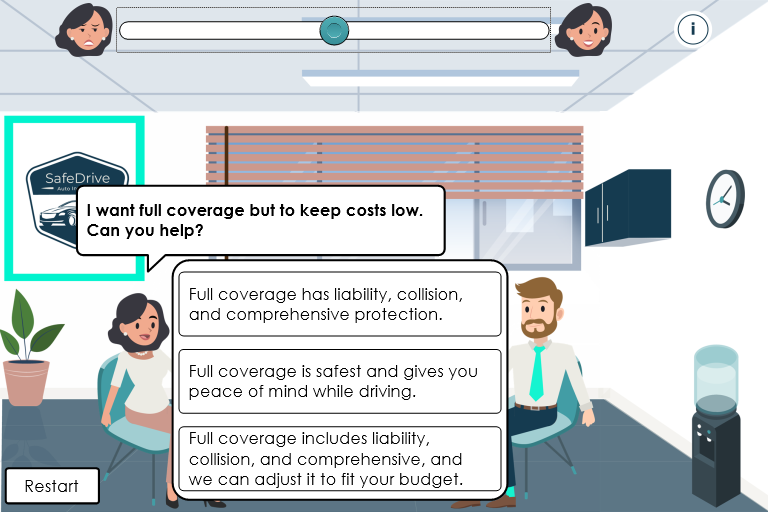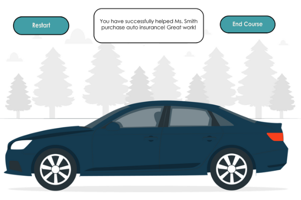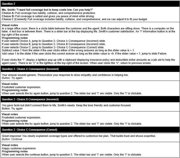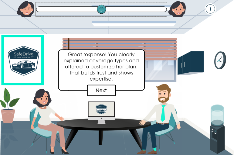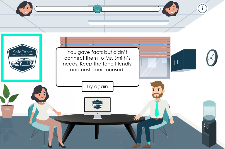 A scenario-based, gamified eLearning experience that helps auto insurance sales agents improve customer interactions in a realistic, risk-free environment.