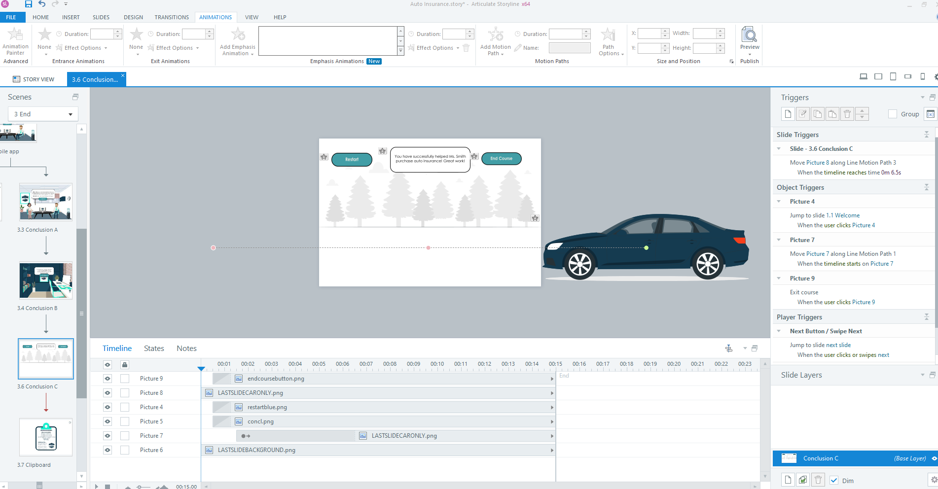 With the interactive prototype complete, I moved into full development. This phase involved refining the slide content, polishing transitions, and ensuring the learning flow felt natural and engaging. I programmed object states, feedback layers, motion animations, and condition-based triggers to give learners a smooth, polished experience.