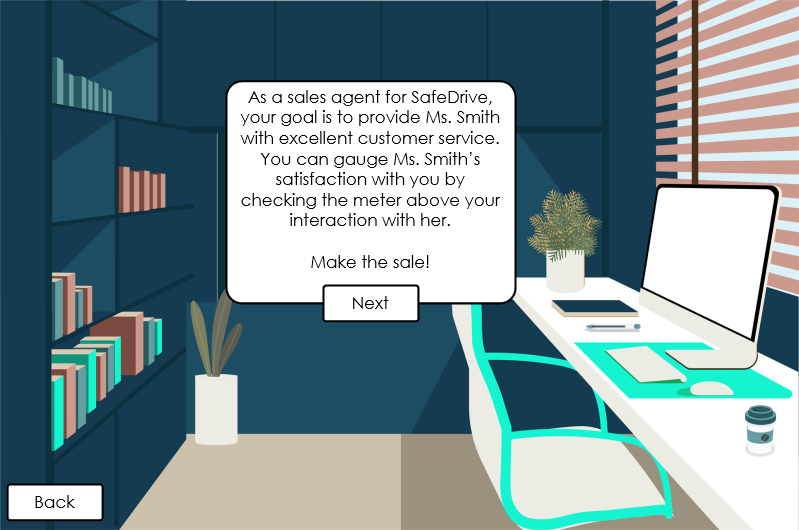 I designed this concept project to simulate real-world customer interactions and train new insurance sales agents on key soft skills like empathy, communication, and problem-solving. The experience uses realistic dialogue, learner-driven decision-making, and a gamified satisfaction slider to deliver feedback and build confidence in a low-stakes setting.